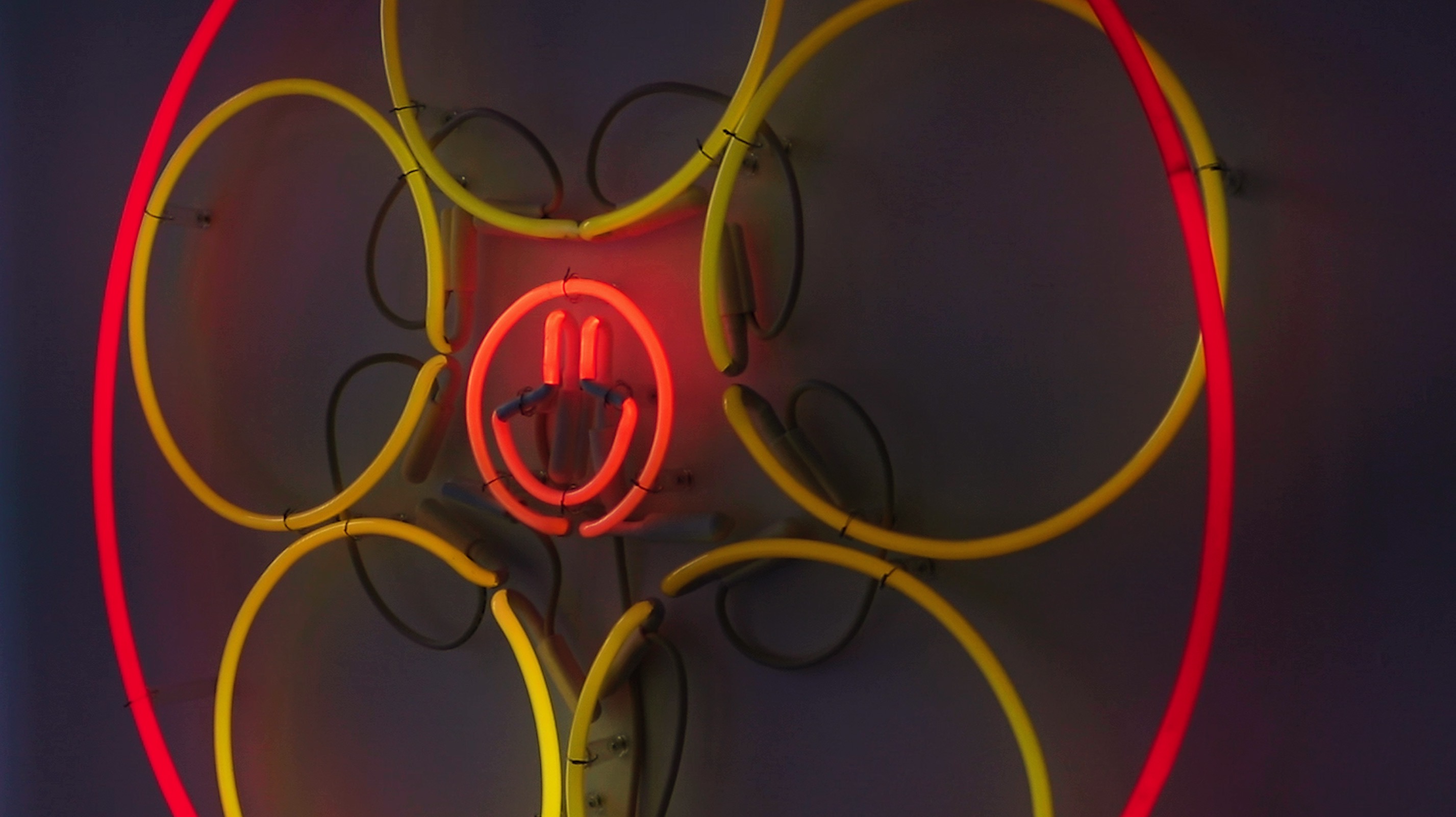 “Smile =)”, neon, argon, mercury, cables, transformer, 36 inch diameter, 2021
